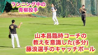 ブルペンでは臨時コーチとして阪神投手陣を指導中の山本昌氏と対面。「カメラは追いかけてくるだろうけど、抜くところは抜いて、絶対に無理をしないように」と激励の言葉を受けた。